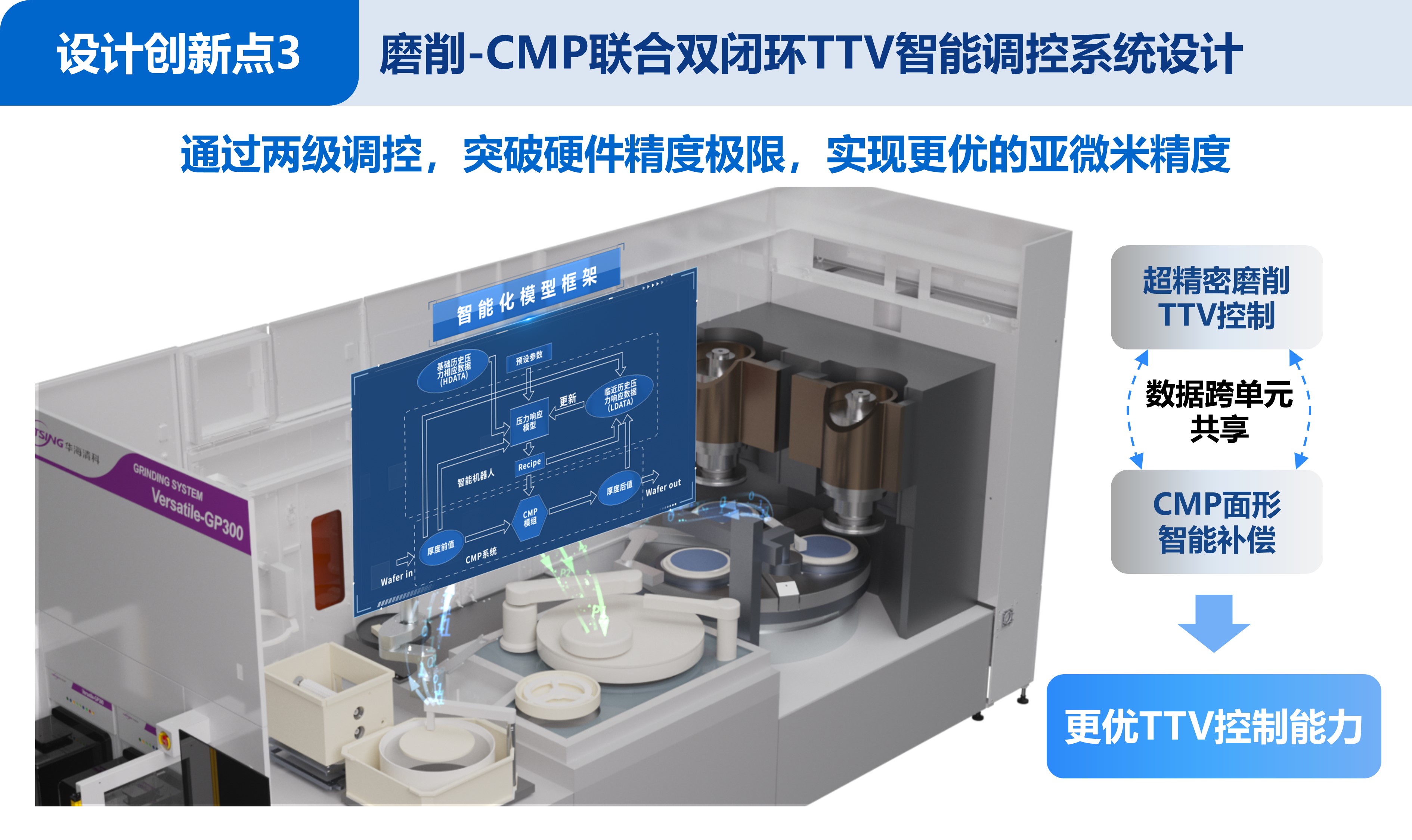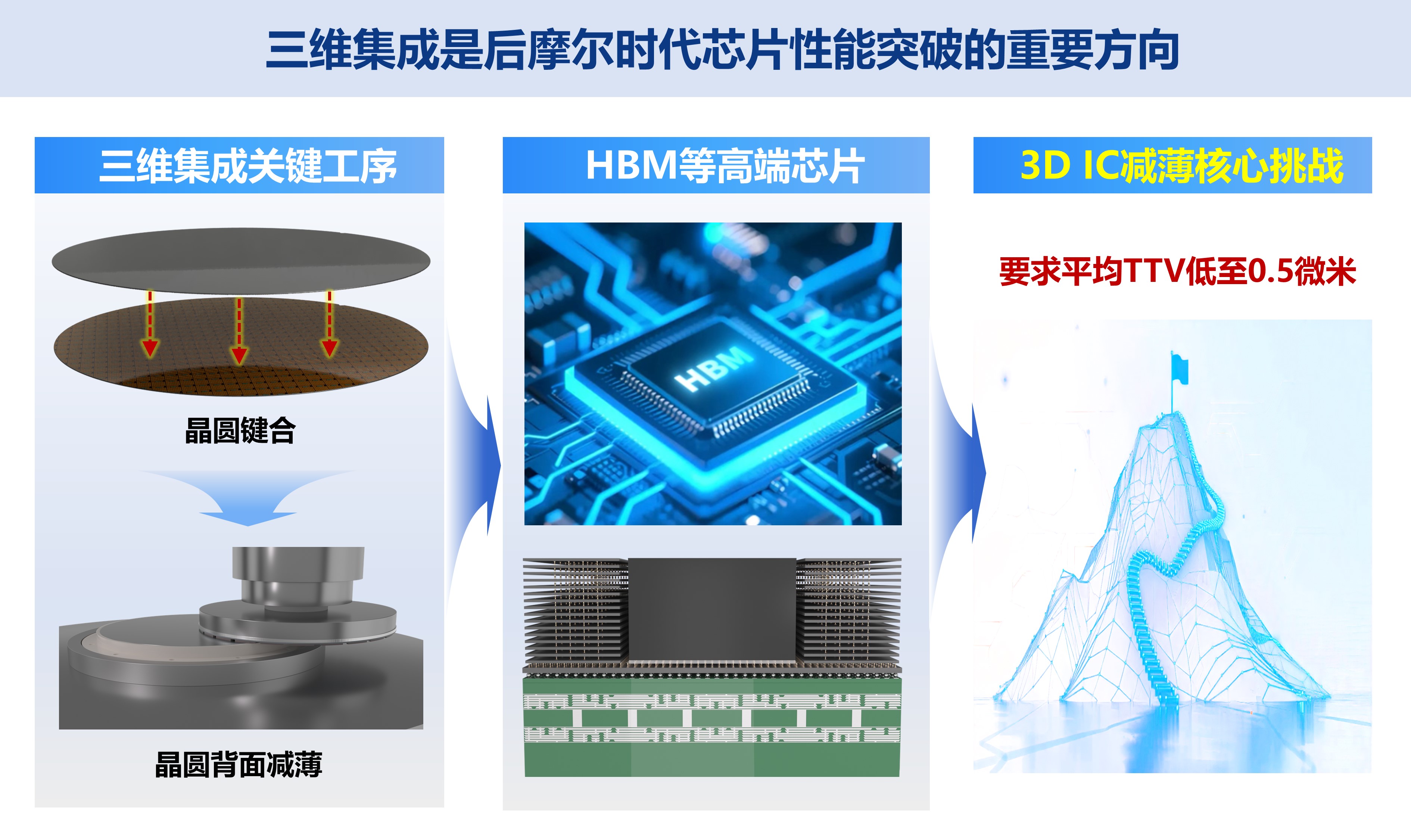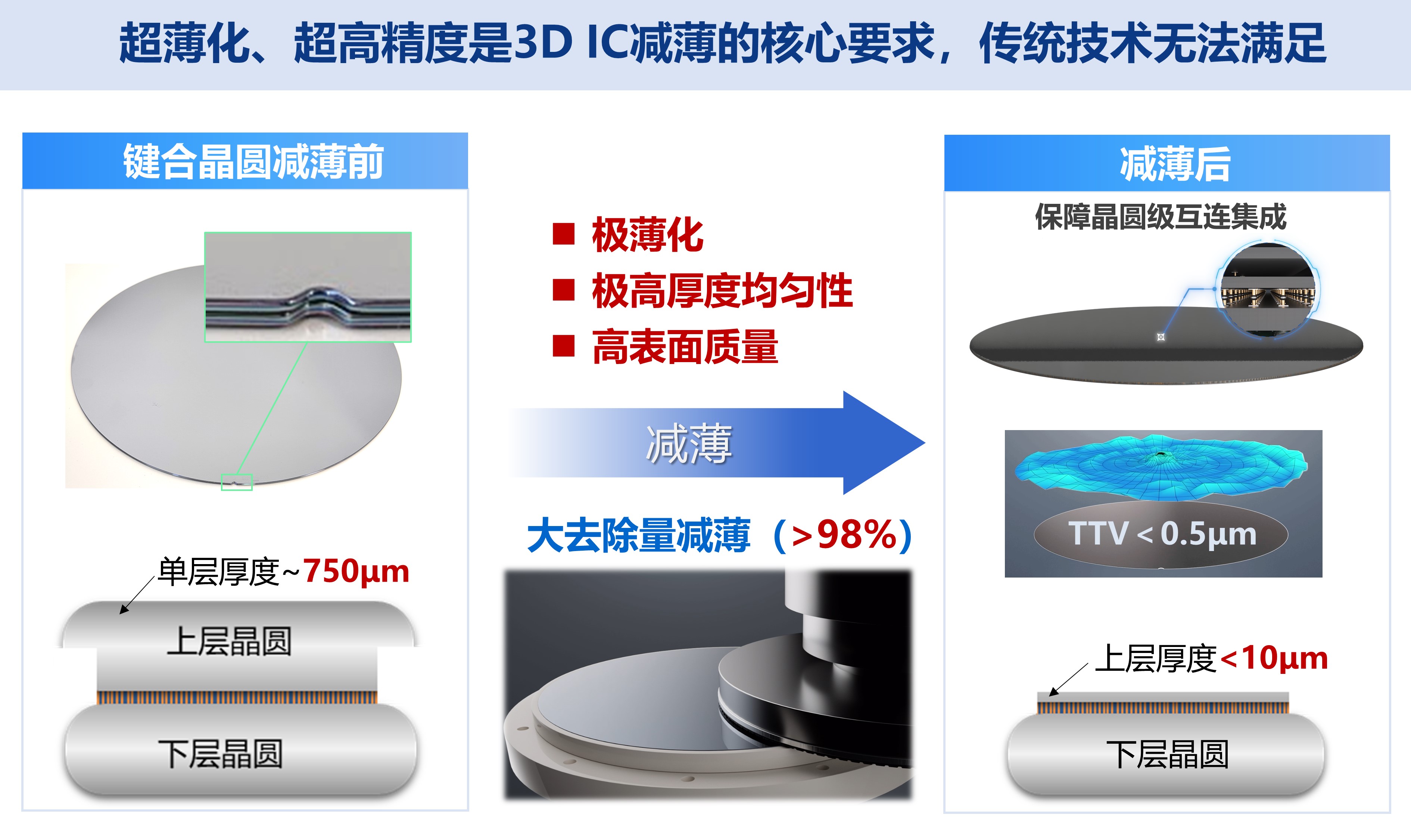 后摩尔时代,传统芯片制造方式趋近物理极限,三维集成芯片(3D IC)技术成为芯片性能突破的重要方向。3D IC工艺需在多片晶圆完成电路制作,通过键合堆叠后对背面进行高精度减薄,通常需要减薄至10 μm以下,全局厚度偏差(TTV)控制到亚微米,以实现多层堆叠与芯片可靠互连,晶圆减薄装备已成为3D IC制造最重要的工业母机之一。然而,传统的减薄装备面临精度瓶颈,难以满足3D IC最新发展要求,严重制约我国3D IC制造的自主可控。本项目跳出以单一磨削为主的传统减薄加工模式,以更高精度目标为导向,创新地提出磨削减薄-CMP-清洗一体化架构设计思路,颠覆了传统减薄加工模式,并通过核心硬件、智能控制、系统工艺等多维度创新设计,成功研制出3D IC制造用的超精密减薄装备,实现3D IC减薄加工精度突破。其主要设计创新如下: