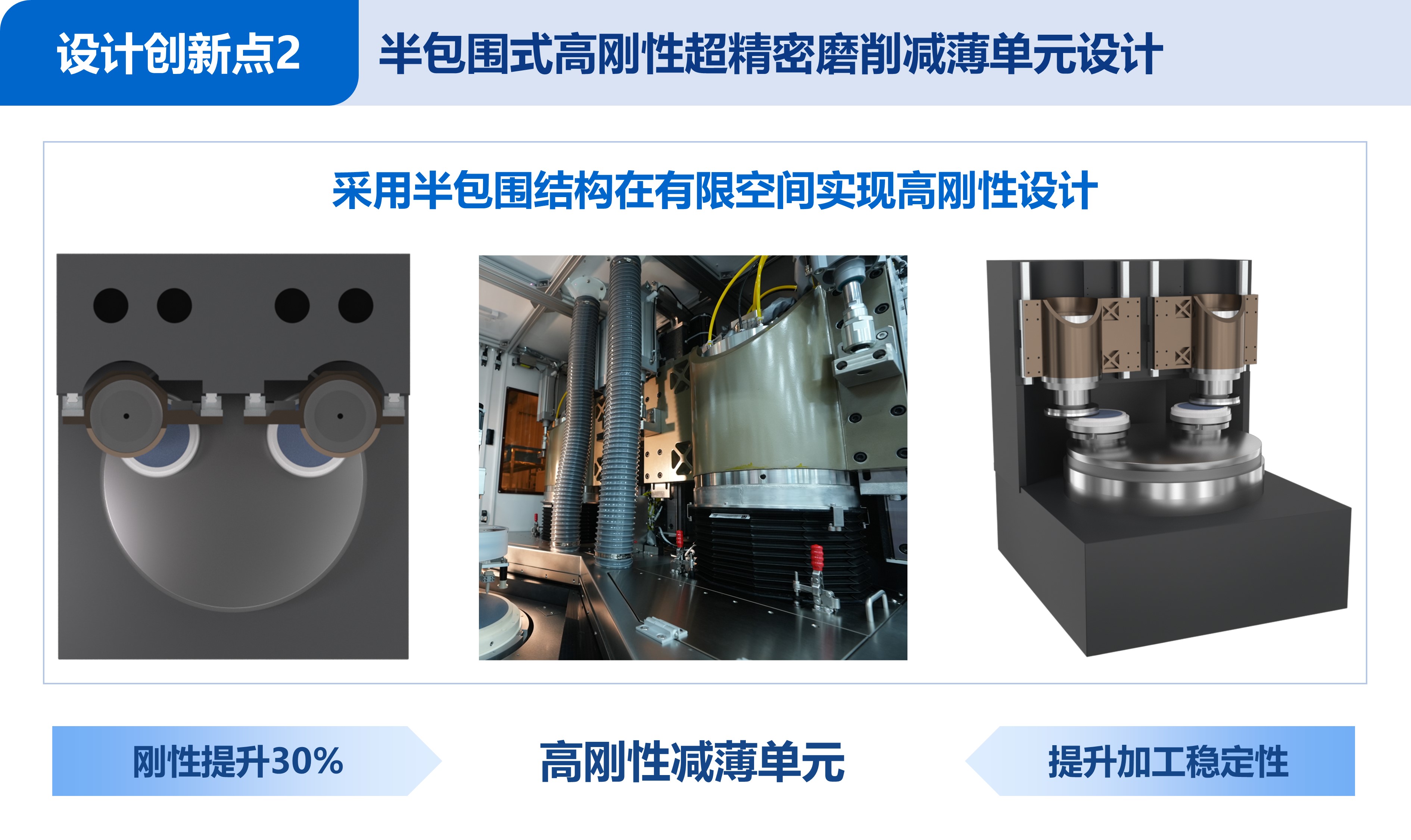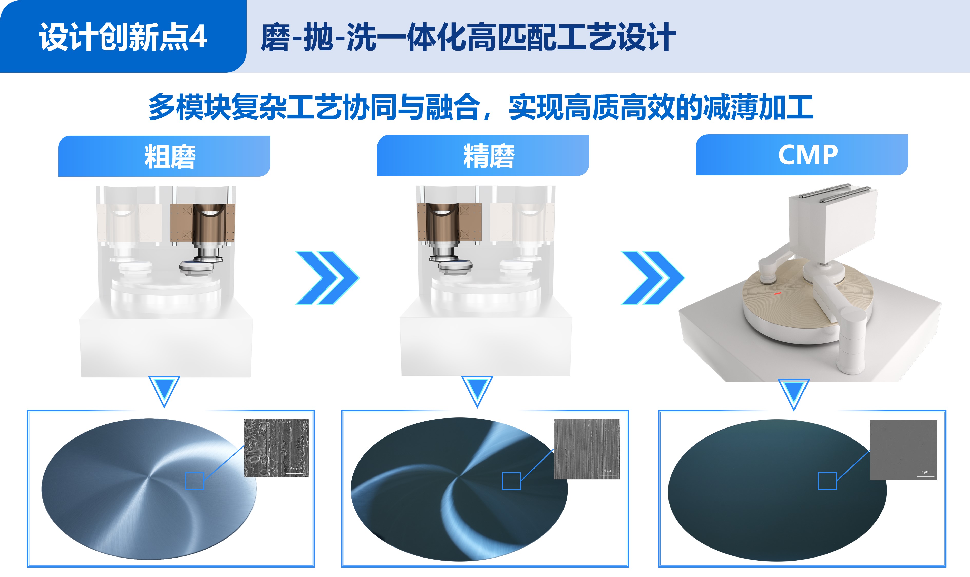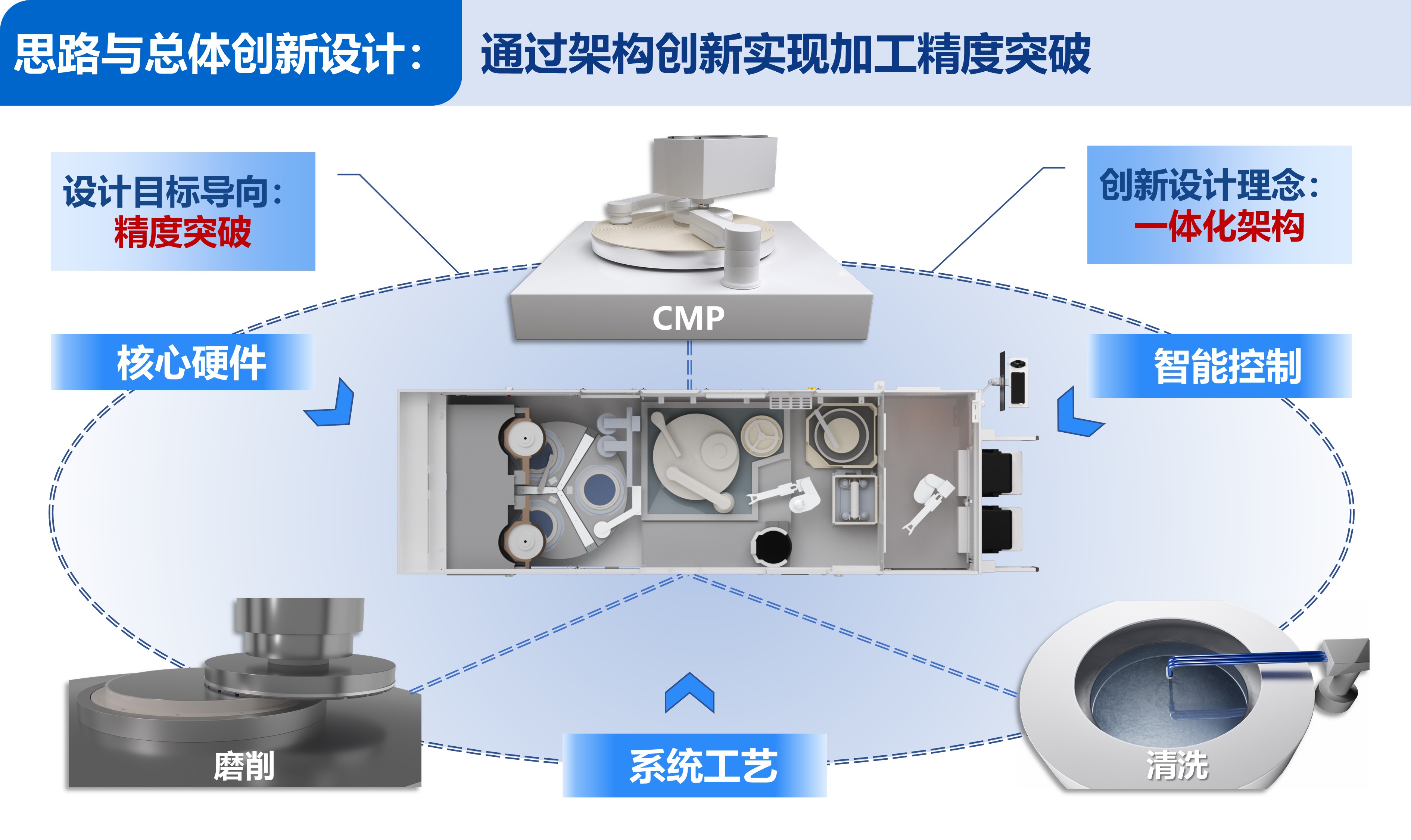后摩尔时代,传统芯片制造方式趋近物理极限,三维集成芯片(3D IC)技术成为芯片性能突破的重要方向。3D IC工艺需在多片晶圆完成电路制作,通过键合堆叠后对背面进行高精度减薄,通常需要减薄至10 μm以下,全局厚度偏差(TTV)控制到亚微米,以实现多层堆叠与芯片可靠互连,晶圆减薄装备已成为3D IC制造最重要的工业母机之一。然而,传统的减薄装备面临精度瓶颈,难以满足3D IC最新发展要求,严重制约我国3D IC制造的自主可控。本项目跳出以单一磨削为主的传统减薄加工模式,以更高精度目标为导向,创新地提出磨削减薄-CMP-清洗一体化架构设计思路,颠覆了传统减薄加工模式,并通过核心硬件、智能控制、系统工艺等多维度创新设计,成功研制出3D IC制造用的超精密减薄装备,实现3D IC减薄加工精度突破。其主要设计创新如下: