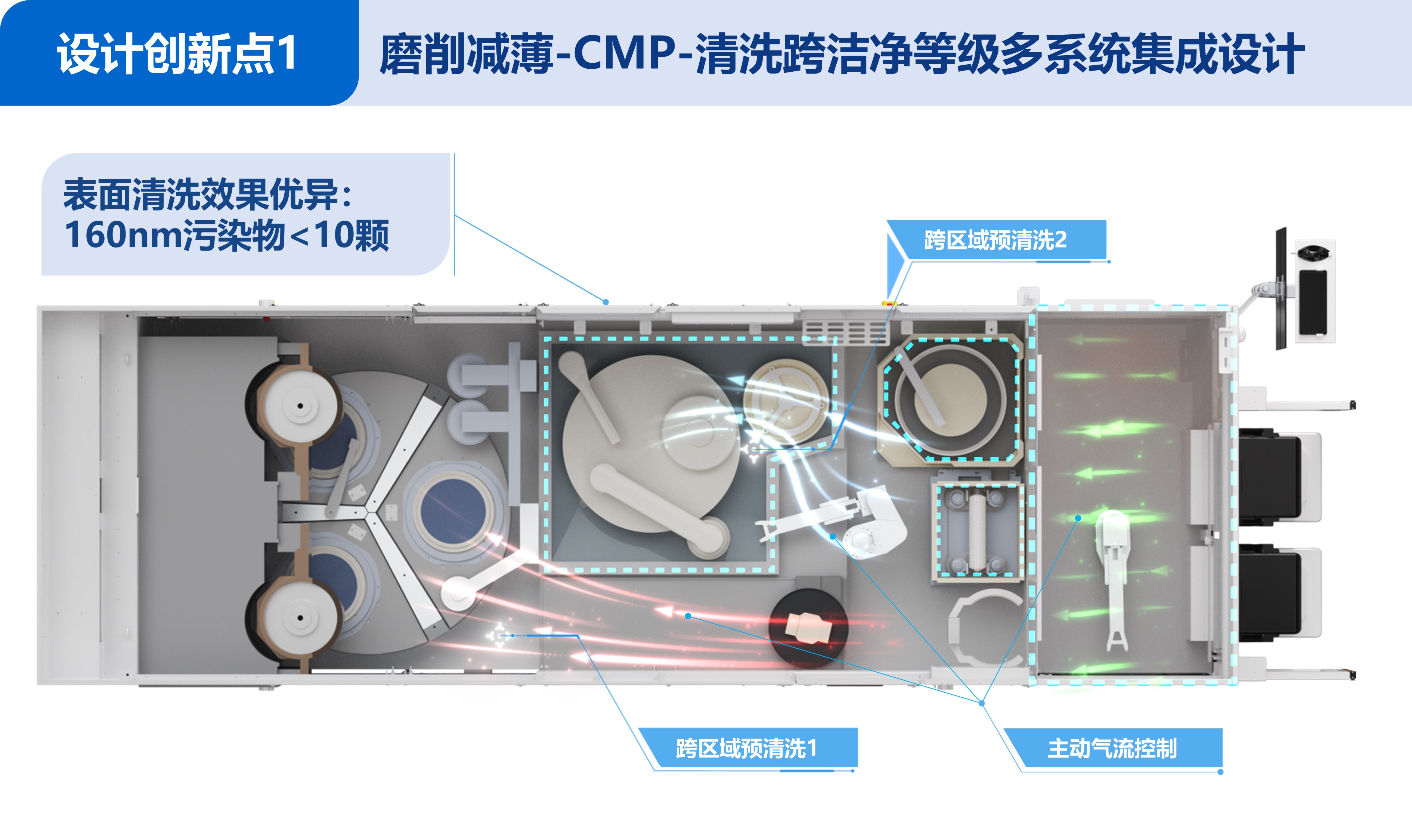 (1)设计了磨削减薄-CMP-清洗一体化的全新减薄工艺模式,实现了跨洁净等级多系统集成。设计了按模组洁净等级串行的紧凑布局,通过多机械手协作实现了复杂工艺模块的连通;采用了跨区域预清洗、封闭腔室气流独立控制和正压洁净气流主动控制三重设计保障,有效避免了交叉污染,实现了系统集成。