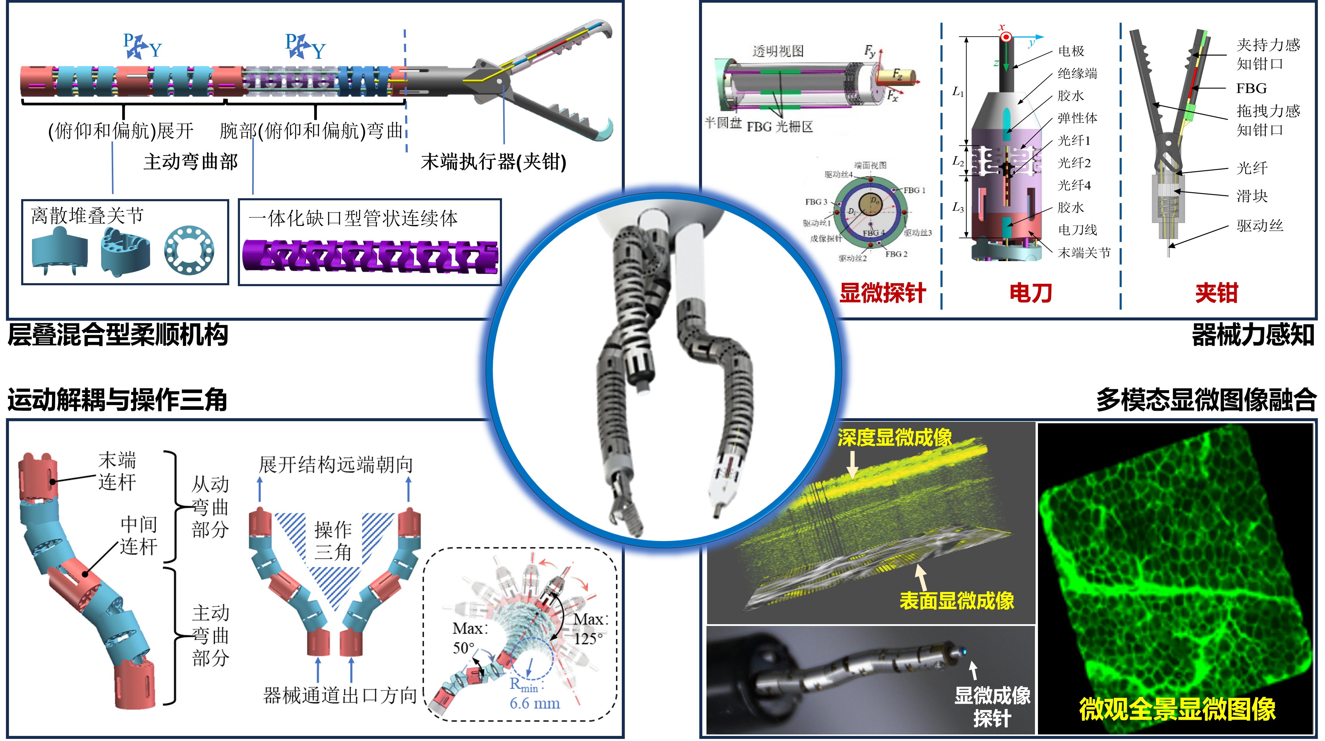 1.诊疗器械创新:基于动作微元思想,设计了层叠混合型运动解耦柔顺机构,形成了柔性诊疗器械小型化与力感知的成熟设计方案,开创了基于多模态显微成像的诊疗一体化新模式,实现了狭小空间下更灵巧、安全的诊疗操作,延伸了医生的诊断与手术能力;