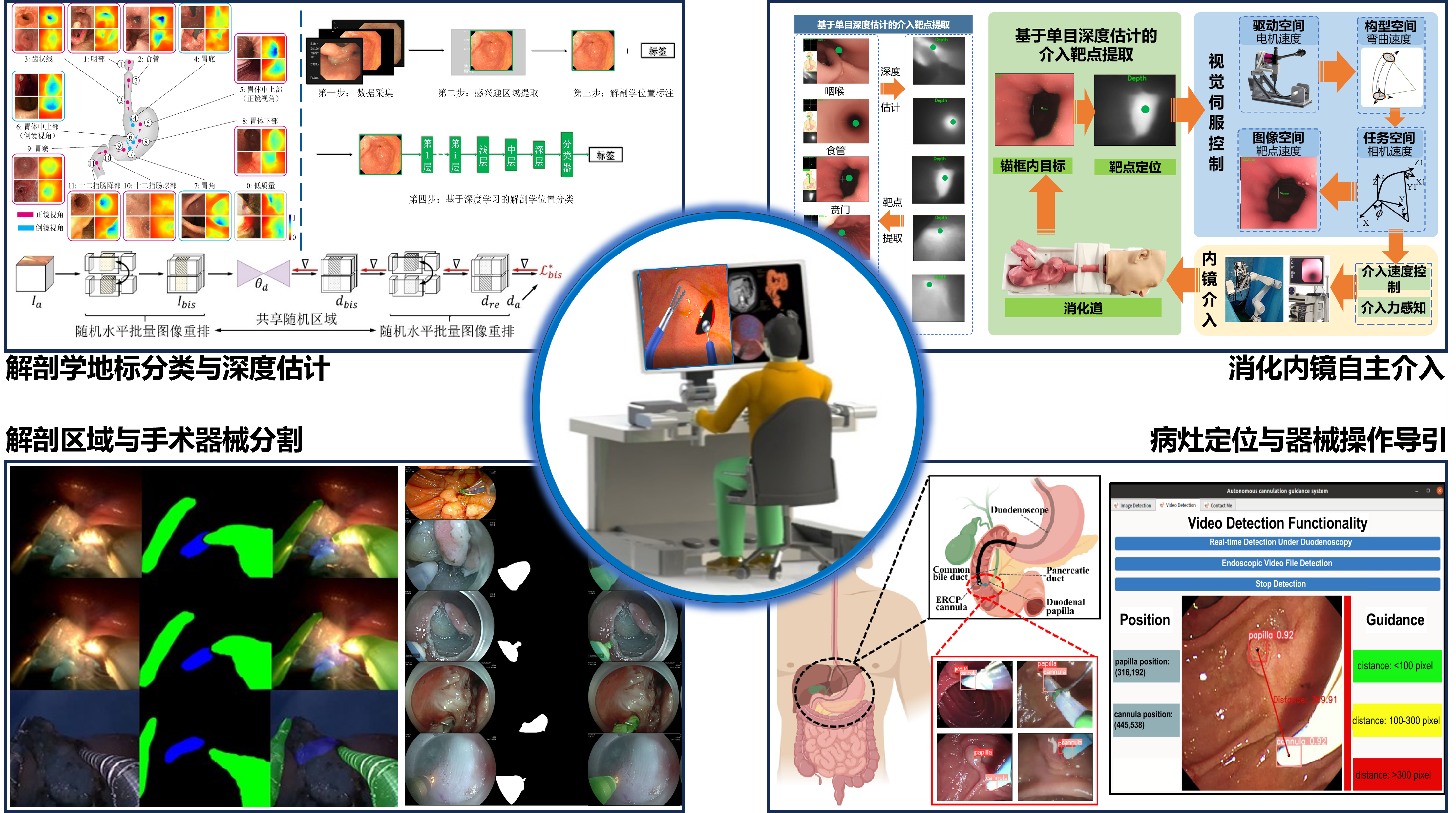 3.定位导航创新:为解决内窥镜下手术不精准、不高效的问题,设计了基于自监督单目深度估计的入路载体自主介入算法,建立了消化道内镜图像解剖学位置分类数据库,研发了柔性诊疗器械的定位与导航方法,实现了术中腔道全景建模与实时定位导航,减少了医生操作负担;