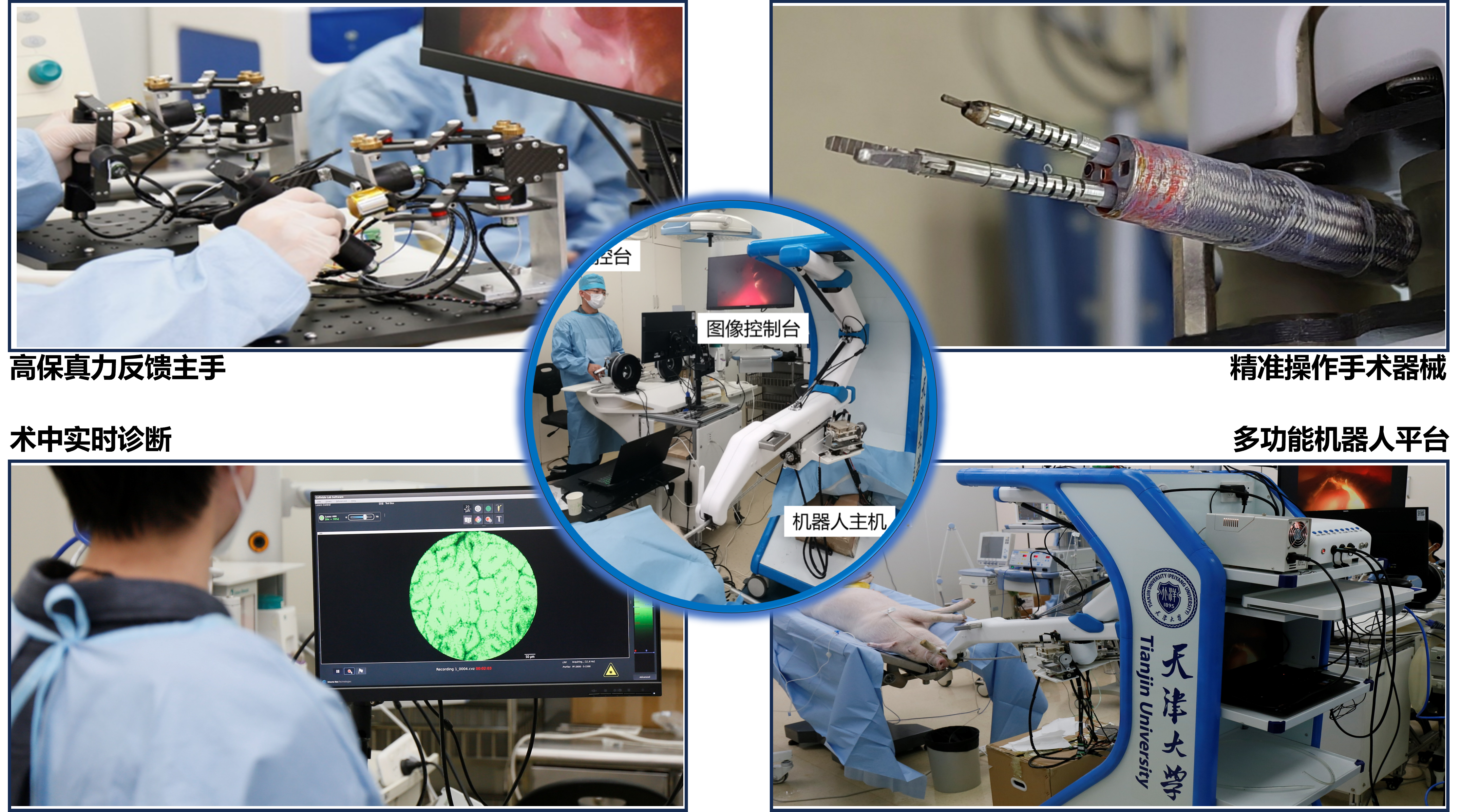 4.应用集成创新:结合消化道诊疗约束条件及各设计创新点技术特征,从内窥镜成像、人机协同与诊疗空间、合规性与可靠性设计、无菌设计等层面突破机器人系统集成设计技术,研制了具有自主知识产权的机器人整机,形成了术中病理诊断与精准手术一体化的临床应用新范式。