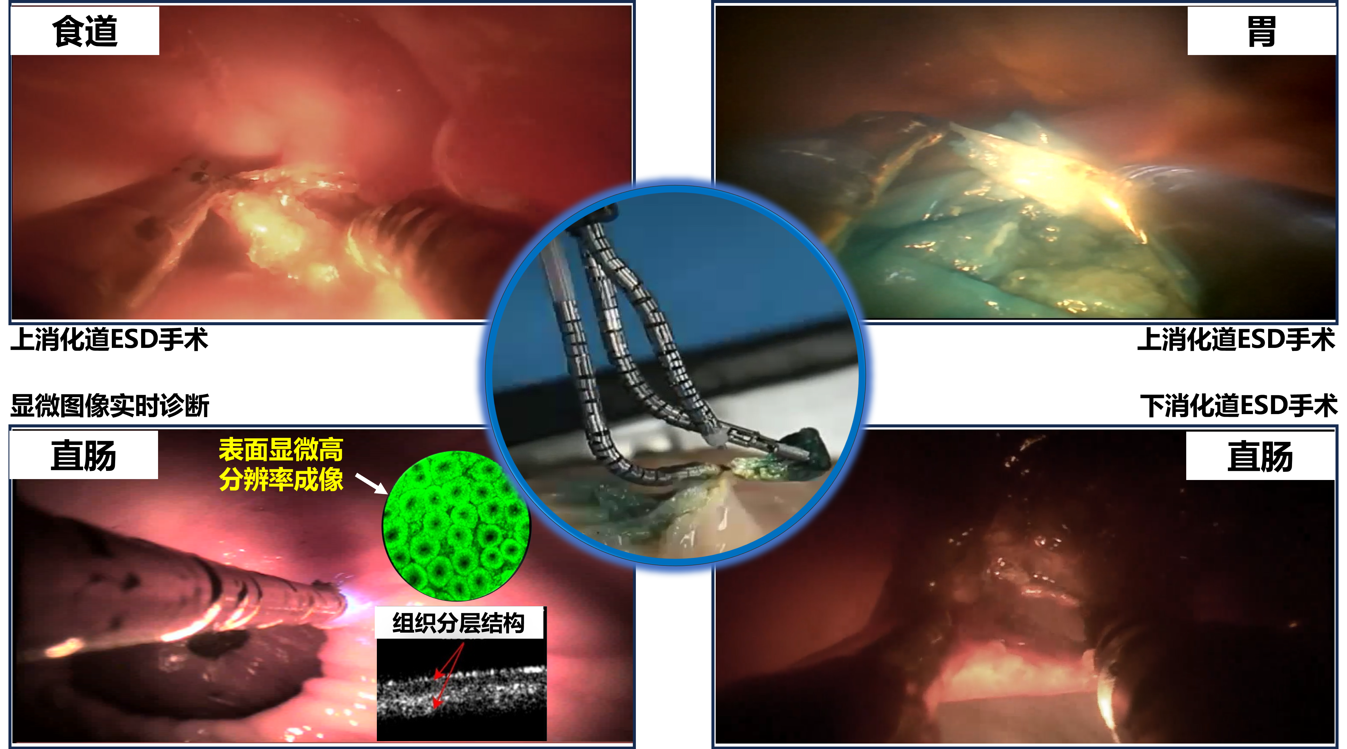 2.入路载体创新:面向消化道早癌诊疗手术实际需求,设计了具备入路刚柔可控、触觉及形态感知、多内窥镜功能一体化融合的消化道柔性手术机器人平台,在降低消化道手术操作难度的同时,提升了医生操作的稳定性与可靠性;