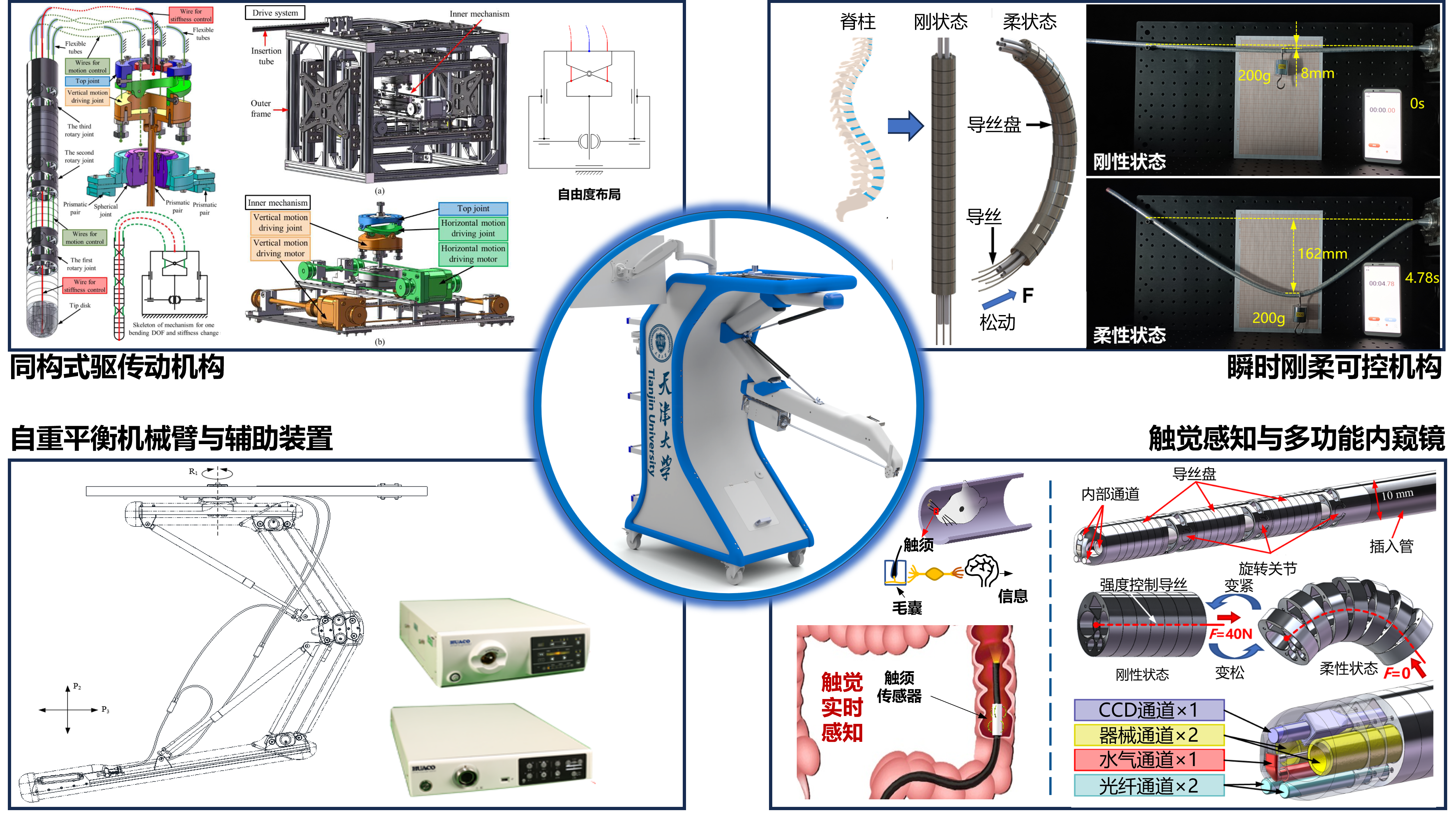 项目在国家重点研发计划、国家自然科学基金等项目支持下,围绕消化道早癌诊疗需求,从诊疗器械创新、入路载体创新、定位导航创新、应用集成创新四个层面开展系统设计,成功研制了具有完全自主知识产权的消化道早癌诊疗柔性手术机器人整机系统,突破了上述技术瓶颈,解决了诊疗过程中“不精准、不稳定、不安全、不高效”四大问题,实现了高端医疗装备设计的颠覆性创新。主要设计创新点为: