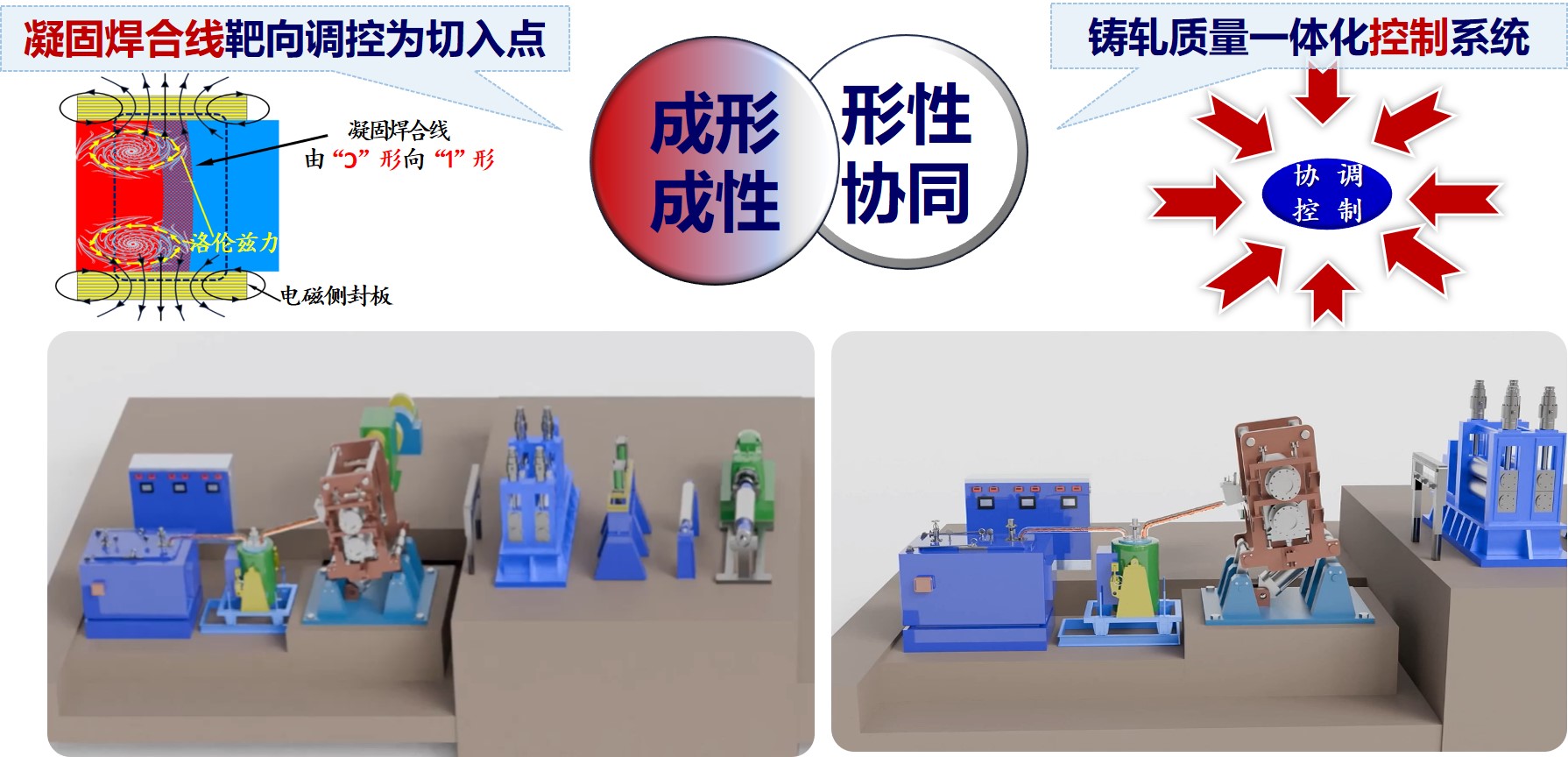 ① 设计发明了三维流场、温度场、磁场等多物理场耦合的铸轧形/性调控技术;