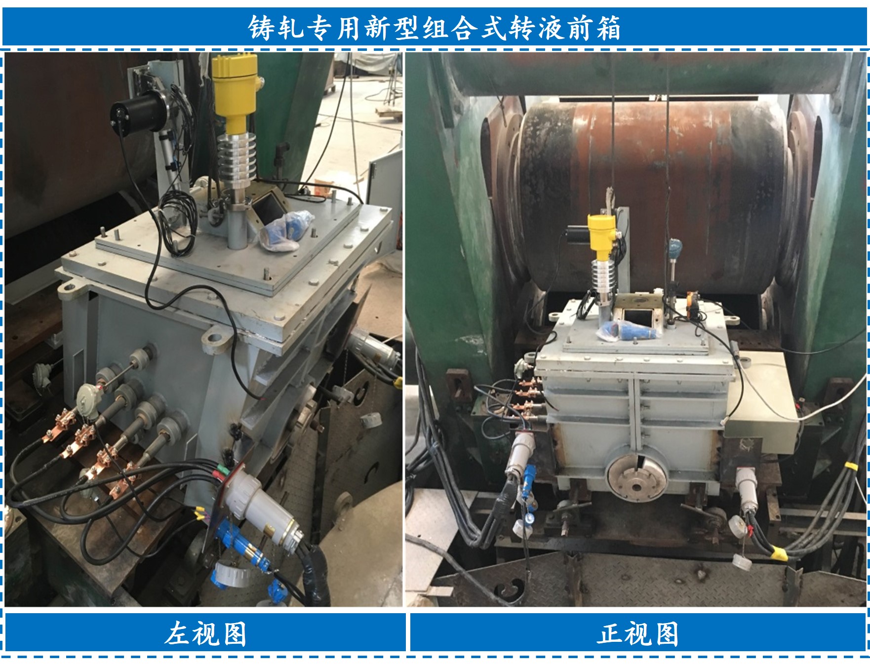 ③ 设计发明了电磁铸轧侧封装置及新型组合式铸轧转液系统,集成研制出电磁辅助调控、倾角可调的双辊铸轧成套技术装备;