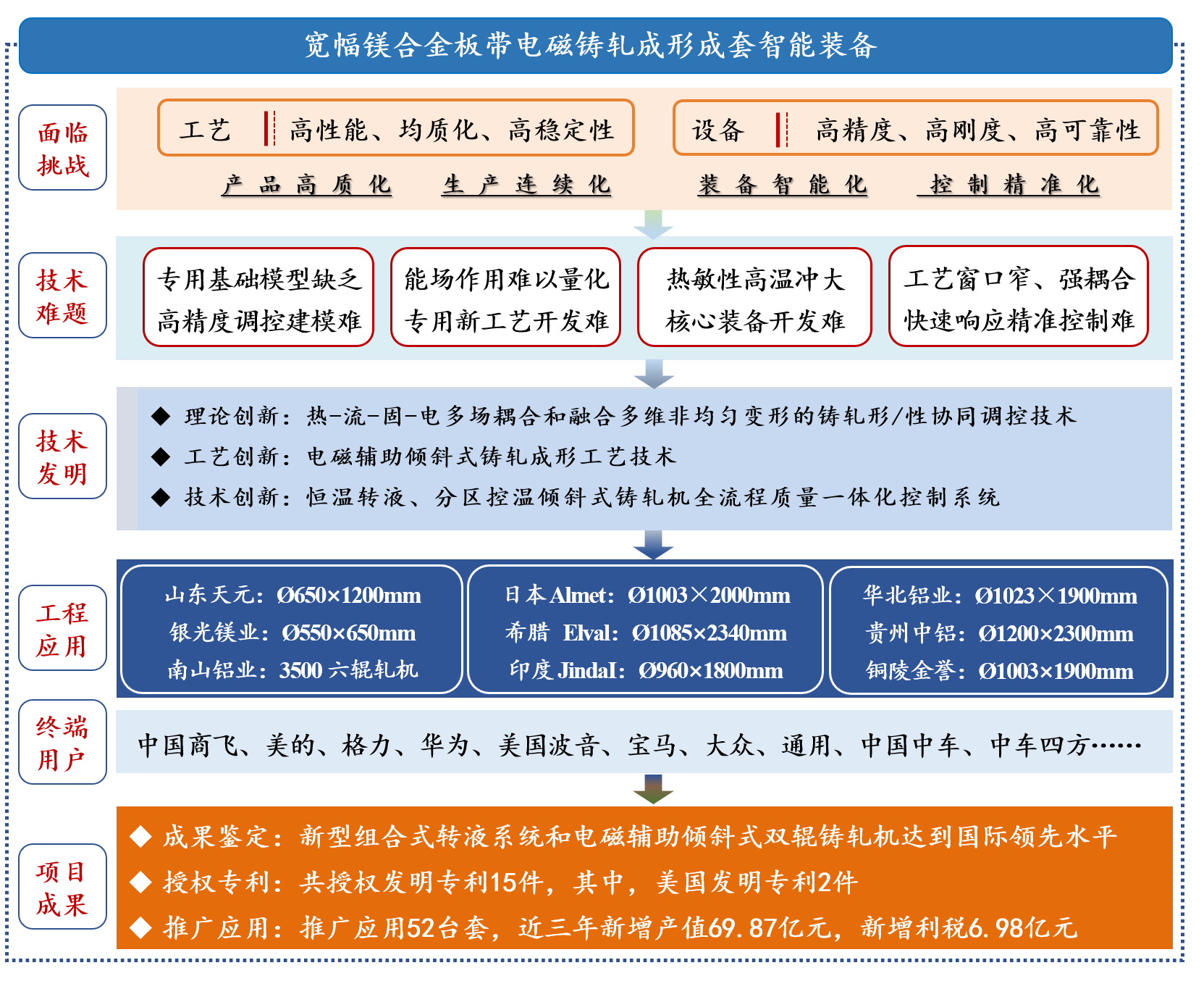 项目获发明专利15项(其中,美国专利2项)。该技术装备能够高效、稳定生产厚度0.7~2.0mm、宽度1200mm、卷重达5吨的镁合金板带,同时在高品质铝合金板带制备中也实现了广泛应用,经王振国院士领衔的专家组鉴定为“该成果创新性强,整体技术处于国际先进水平,其中,设计的铸轧专用新型组合式转液系统和电磁辅助倾斜式双辊铸轧机达到国际领先水平”。在日本东洋、八达镁业、银光镁业、贵州铜陵、山东天元等企业推广52台(套),打破国外技术垄断,引领了镁合金电磁铸轧技术发展。近三年新增产值69.87亿元,新增利税6.98亿元,产品在商飞、中车和宝马等企业得到应用。